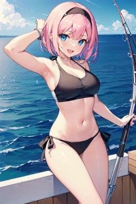 (1girl, cute girl, shiny body, shiny skin, middle breasts), (pink hair, short bob hair, hairband, blue eyes),BREAK((life jacket, denim shorts)), (show off the fish you caught:1.5), (on fishing boat out at sea:1.3), cowboy shot, nose blush, grin, looking at viewer, close to viewer,BREAK(masterpiece:1.2), (((best quality))), ((ultra-detailed 8k CG)), (extremely detailed CG:1.2),(unity 8k wallpaper:1.2), ((high resolution)), ((perfect anatomy)),BREAKsuper detailed skin, beautiful detailed eyes, perfect arms, perfect hand, perfect finger, perfect legs,