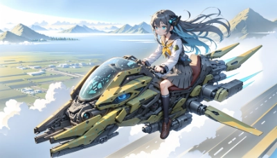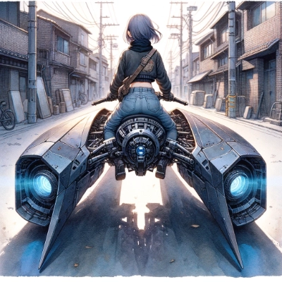 High-resolution, deformed anime-style watercolor illustration with a dynamic angle, in a wide format. The scene features a young girl android riding a sci-fi mechanical vehicle resembling a flying fish, now predominantly in shades of red, in a post-apocalyptic city during late autumn. The vehicle has a narrow, elongated seat, indented on the top, and is about 50cm wide. A prominent white envelope (✉) symbol is painted on the vehicle, symbolizing its purpose for delivering messages. At the rear of the vehicle, there's visible luggage. The android is in a forward-leaning position, straddling the red vehicle with the envelope symbol. The vehicle emits a faint blue glow from its underside. It's afternoon, with buildings surrounding them. The android is wearing a rugged, post-apocalyptic version of a school uniform and long coat, a scarf, and her hair is back-length black with a hint of blue.
