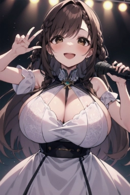 masterpiece, best quality, extremely detailed, anime, 1girl, solo, long hair, brown hair, brown eyes, blush, smile, open mouth, huge breast, white dress, flower, microphone, braid, jewelry, <lora:hairdetailer:0> <lora:eyecolle_odamaki_v100:1> ,
