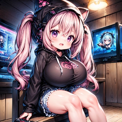 ネオンのゲームテーマのヘアクリップで結んだバブルガムピンクの髪を二つのポニーテールにしています。彼女の目はサイバネティックな青色で光っており、MMOでの勝利に向けて準備万端のヘッドセットを装着しています。彼女はオーバーサイズのゲーマーフーディーを着ており、可愛らしいちびキャラクターデザインが施されています。フーディーの背面は彼女のショーツを越えて垂れ下がり、プレイフルで若々しいルックを演出しています。