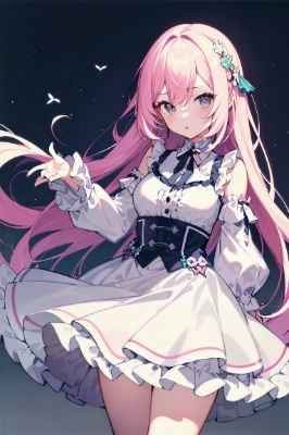 masterpiece, best quality, extremely detailed, anime leaning forward, grace, Perfect female body, girlan extremely delicate and beautiful girl, detailed long hair, pastel pink hair, absurdly long hair, embarrassed, large breasts, Red eyes, graceful full dress, frilled sleeves, translucent fluttering skirt, The skirt sways with the wind, white silk Clothes, beautiful detailed glow, floating palaces, beautiful detailed water, Flying splashes,,