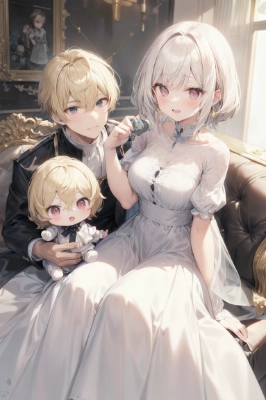 「この人形、君が作ってくれたの?」 「単に裁縫の練習をしただけですわ」 「ふふ。僕にそっくりだね」 「そ、それは、偶然そうなってしまっただけで…」 「あれ、でも…」 「な、なんですの…?」 「髪は僕と同じだけど、この瞳の赤紫色は君の色だね」 「い、糸が…っ、たまたまその色しかなかったのですわ…!」 「将来、僕と君の子供はきっとこんな感じだね」 「──…っ!?」