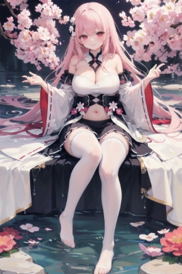 masterpiece, best quality, extremely detailed, anime, girl, skirt, sleeping, Perfect female body, girlan extremely delicate and beautiful girl, very long hair, Air bangs, pastel pink hair, absurdly long hair, arrogant smile, large breasts, Bare navel, barefoot, Red eyes, extremely detailed lace, delicate wet dress, detached sleeves, white stockings, overexplosure, strapless, beautifuly color Clothes, beautiful detailed glow, surrounded by floating sakura, sakura, an extremely delicate and beautiful,,