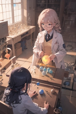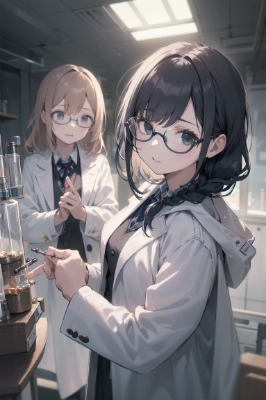 Middle school students girl Japanese whistle ((4girls)) moody lighting Sarah uniform (Wearing a white coat) face forward test tube beaker astronomical observatory club activities ((look through an astronomical telescope)) Overhead composition long black hair hairstyle black eye missing digit fused finger,