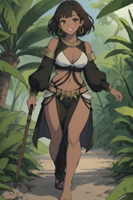 4D, girl,(8K quality, highly detailed, masterpiece, ultra-detailed), ray tracing, low angle, walking, amazon, jungle, BREAK(Brown skin:1.2), (1 girl, 17 years old), smile, very cute face, black bob hair, golden eyes, earrings, golden accessories,BREAKbarefoot, ragged clothes, decorated loincloth, <lora:faceage:1> <lora:eyecolle_begonia_v100:1> ,