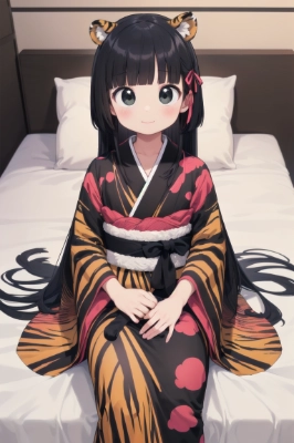 (((very longest hair))),black hair, smile,straight Hair,hair ribbon,mintgreen stripe,Black Eyes,flat chest,straight Across bangs,princess Cut, Very Long Sideburn,roundry Head,Droping eyes,,cute,Meekness,Bob Cut,long back hair,12 years Old,Kimono, rays of light,Sunlit,
