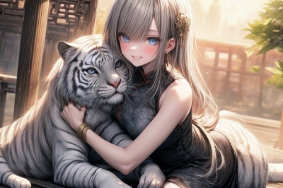 (masterpiece), (best quality),(ultra-detailed),(illustration),(extremely detailed),(perfect anatomy),(super detailed skin),(detailed),(beautiful detailed eyes)1girl,solo,(a white tiger stands behind the girl), Please draw a picture of an exquisite girl in a princess dress with delicate gold metal decorations. She stands there looking at me, far from viewer, sitting on the chair, incredibly detailed, girlan extremely delicate and beautiful girl, lowing long hair, Lateral braid, gold hair.lace, beatiful detailed hair, Beautiful face, evil grin, thick eyebrows, extremely detailed eyes, perfect hands, large breasts, beautiful detailed blue eyes, gold fringes, extremely detailed gorgeous tiara, Beautifully gorgeous necklace, frilled dress, frilled sleeves, summer long skirt, high heels, Lace, strapless, white tiger, chair,throne room,wide shot, , <lora:flat2:-1> <lora:hairdetailer:1> <lora:sanDka1:0.35> ,