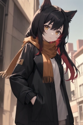 cute girl, 15 years old, small breast, black hair, medium long hair, red inner colored hair, cat ears, gold eyes,