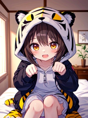 (tiger motif bust band, navel, tiger motif hotpants, tiger hands:1.2), bare shoulder, dynamic, cute pose
