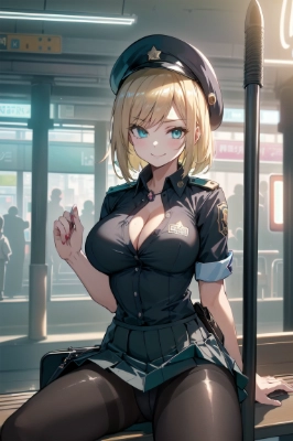 masterpiece,best quality,ultra detailed beautiful face and eyes,station staff,(1girl),(mature_female),(station staff),(fox_girl),(adult),(slender),(medium hair),(curly hair),(yellow hair),(yellow eyes),(medium breasts),(fox tail),(((cute station uniform))),((cute kneehighs)),((cute pumps)),((cute station cap)),