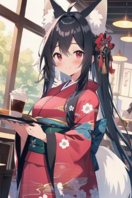 solo,14years old,cowboy shot, dynamic angle,shiny_skin, in the coffee shop,((fox girl)),female, ((long green hair)),messy hair, shiny hair, ahoge,smile,open eyes, cute anime face,kimono, light smile, bright eyes, red eyes, white skin, one piece,dress,holding a tray, extremely detailed CG unity 8k, absurdres, highres, large breast,<lora:noline:0.35> <lora:asb-CH2:0.4> ,
