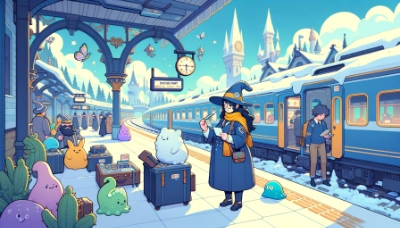 魔法使いの駅のホーム。汽車。スライムもいる。大勢の魔法使い。 青空。冬。