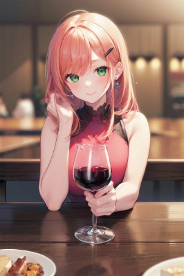 (masterpiece), (best quality),(ultra-detailed),(illustration),(extremely detailed),(perfect anatomy),(super detailed skin),(detailed),(beautiful detailed eyes),1girl,cute,solo,orange hair,green eyes,large breasts,long hair,pink shirt,sleeveless shirt,sleeveless,shirt,hair ornament,hairclip,earrings,jewelry,elbow on table,hand in own hair,holding cup,holding,wine glass,blurry background,blurry foreground,red wine,table,pov across table,smile,food, <lora:flat2:0> <lora:hairdetailer:1> ,