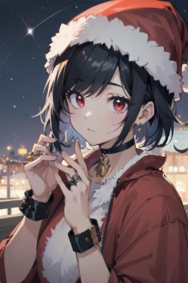 Master piece,Best quality,beautiful detailed ,ultra detailed,extremely detailed,1girl,red eyes,dark black hair,short hair,mullet hair style,smile, BREAK , punkrock style fashion ,winter clothes, (leather jacket:1.3), warm scarf, plaid skirt, black tights, punks belt , looking at viewer,