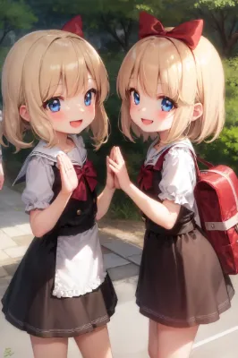 loli,height difference, 2girls, (twins:1.4),sisters, portrait, cowboy shot, indoors, ,yuri, deep kiss,embarrassed, hug,outdoors,tree,blond hair,short hair,blue eyes,hair bow,