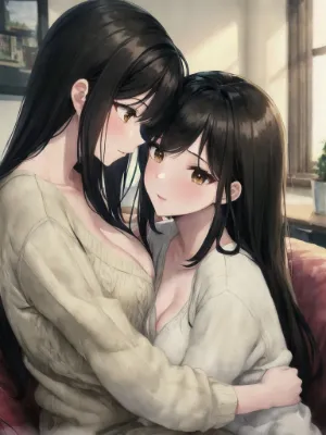 2girls, ,slender, brown eyes,medium breasts, (black hair:1.2),long hair, swept bangs,ear,taut sweater, v-neck