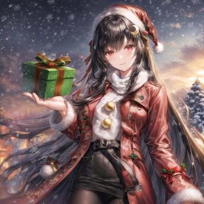 Gold City,Holding a Christmas present box,<lora:Uma - Gold City v1:0.8>