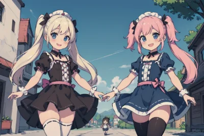 little girls, twin girls, curvy, wide hips, flat chest, thighhighs,(masterpiece), absurdres, (best quality), best quality, 8k, beautiful art, ultra-detailed, illustration, ((kawaii)), cute, indoor, twin girls fight, angry, face to face,