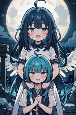masterpiece, best quality, extremely detailed, anime, a star, stars, starry sky, , girl, longhair, ahoge, wet hair, short sleeve, blue hair, green eyes, succubus, demon, angel, princess, dancer, fantasy, cooking, church, full moon, winter, night, sweating, singing, blushing, tears, smile, crying, lying down, happy,