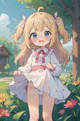 masterpiece best quality extremely detailed anime ((((little female child)))) ((loli)) ((toddler)) ((preschooler)) two side up long blonde hair pink ribbon sash white dress ((frills)) long sleeves standing white panties panty shot dress lift wind outdoors floral garden kindergarten preschool embarrassed (((blush))) (tears) [blue eyes],