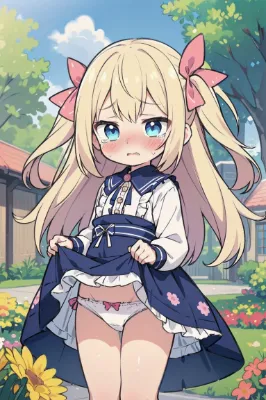 masterpiece best quality extremely detailed anime 2girls ((((little female child)))) ((loli)) ((toddler)) two side up long blonde hair silver hair pink ribbon red long dirndl ((frills)) long dress floral garden ((embarrassed)) ((blush)) smile face to face (from side) (looking away) looking at each other hugging each other blue eyes yuri beautiful landscape wide shot <lora:flat2:-0.3> <lora:hairdetailer:0.5>,,,