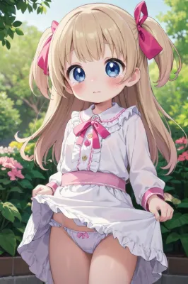 masterpiece best quality extremely detailed anime ((((little female child)))) ((loli)) ((toddler)) ((preschooler)) two side up long blonde hair pink ribbon pink sash white dress ((frills)) long sleeves standing white panties panty white panties shot dress lift outdoors floral garden kindergarten preschool embarrassed (((blush))) (tears) blue eyes, <lora:flat2:-0.5> <lora:hairdetailer:1> ,