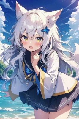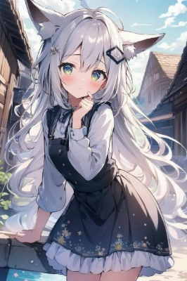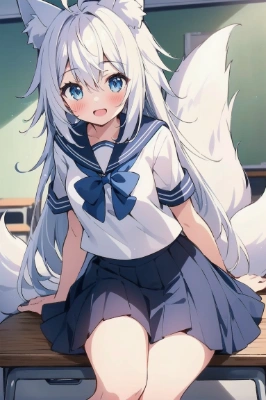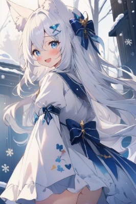 ((masterpiece, best quality)),dutch angle,cowboy shot,2girl,fox girls,swept bangs,white hair,hair ribon, extremely detailed, anime,looking at viewer,smile,open mouth,kneeling,shrine maiden clothes ,off shoulder,smile,(autumn garden),,