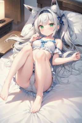 1girl, ((masterpiece)), ((best quality)), (ultra-detailed), ((kawaii)), (lovely),game cg,18years old,(fox ear:1.3),silver hair:1.3,green eyes,twintail ,hair intakes:1.3,Frilled headband,cute lingerie:1.3,bedroom,,