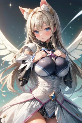 girl,RAW photo, best quality,realistic, photo-realistic, best quality ,masterpiece,an extremely delicate and beautiful, extremely detailed,2k wallpaper, Amazing, finely detail, 8k wallpaper,huge filesize , ultra-detailed, highres, extremely detailed,realistic, 8K, Ultra-High Definition, highest quality, ultra high resolution, (realistic:1.3), High quality texture, (2girls:1.1), robot suit, cat ears, cat tail, medium breast, blond hair, pattern, (tan:1.2), wet hair, , wet skin, (jumper dress:1.5), <lora:flat2:-0.7> <lora:sanDka2:0.2>,,
