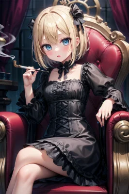 1girl,black bow,black dress,black footwear,bow,brown hair,cathedral,closed mouth,collared dress,day,dress,feet out of frame,frilled shirt collar,frills,gothic lolita,lamppost,lolita fashion,long hair,long sleeves,looking at viewer,outdoors,pantyhose,puffy long sleeves,puffy sleeves,purple eyes,shoes,evil smile,solo,tower,white pantyhose ,