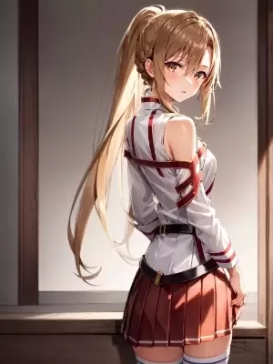(masterpiece:1.2), (hyper extreme detailed:1.2), (illustration), extremely detailed face, best quality, high resolution, highres, (person close up and focus), (solo focus), (1girl), 18 years old, (asuna (sao):1.2), sitting on chair in classroom, (looking over eyewear:1.2), from above, ([brown::0.9] eyes), beautiful detailed eyes, glow eyes, (red-framed eyewear), ([light brown::0.9] hair), long hair, french braid, parted bangs, shiny hair, beautiful detailed hair, shiny skin, medium breasts, ([black:blue:0.5] blazer), ([white::0.9] dress shirt), ([white:red:0.5] tartan pleated mini skirt), [red::0.9] neck ribbon, cinematic lighting, cinematic shadow, ray tracing, detailed light, strong rim light, detailed rim light,