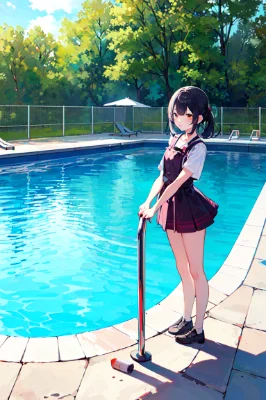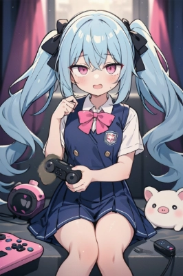 perspective, 1girl, cute, twintail, blue hair, pink eyes, reaching up, ,