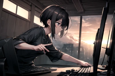 (((Masterpiece, High Quality, 4k, Best Quality, high resolution, profile, 1 girl))), Hundred Crack Fist, Luohan strike, keyboard rapid typing, evening, thin clouds, low clouds, headband, dimly lit room, Nixie tubes, squinted eyes, beaming smile, martial arts pose, intense focus, computer in dark room, vintage electronics, action sequence, flurry of hands, glowing ambient light, serene urban dusk, combat stance, joy in challenge, rapid movement blur, sunset hues, digital warrior, analog and digital fusion, serene concentration, keyboard warrior, intense gaming session, tranquil yet dynamic setting,black eyes, white pupils,more_details:-1, more_details:0, more_details:0.5, more_details:1, more_details:1.5, best quality, extremely detailed, anime, girl, skirt <lora:flat2:-0.05> <lora:hairdetailer:0.15> ,
