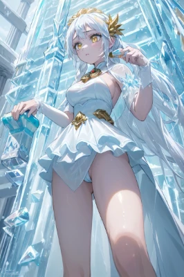 masterpiece,best quality,ultra detailed beautiful face and eyes,((((((1girl trapped in an icicle and frozen in ice)))))),((bishoujo)),((legend princess)),((teenager)),(white_marble_glowing_skin),(curvy),(round face),(yellow hair),(long hair),((gold eyes)),(big breasts),(((pure white legend silk Backless Dress))),(((pure gold legend breslet))),(((pure gold legend sandals))),BREAK ((pure white legend panty)),(((legendary chest_jewel))),((expressionless)),((standing)),((spread legs)),((constricted_pupils)),(((between the kings of collapsed ruins))),(((((ice blizzard))))),((((ice effect)))),((((((ice block around her)))))),(full_shot),(((panty_peek))),((from_below)),((looking_away)),
