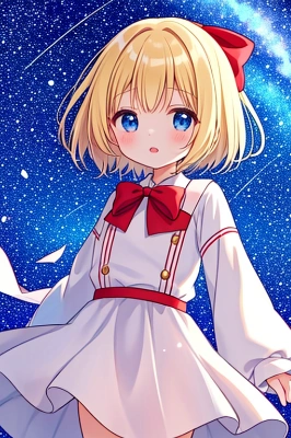 masterpiece, best quality, hyper extreme detailed, illustration, (((((1girl)))), (((loli))),hair bow,red bow,short hair, [blush], (worried), (platinum blonde hair), (shiny hair: 1.4), (straight hair), (floating hair:1.5), hair between eyes, blue eyes,, flat chest, *//* blouse, skirt, (starry_sky:1.4) shooting star), (crescent moon:0.5), (((from_behind, from below, one hand_up))) , (((backlighting))), one-point perspective, cinematic lighting, cinematic shadow, dramatic angle, depth of field, lens flare, light rays, light particles