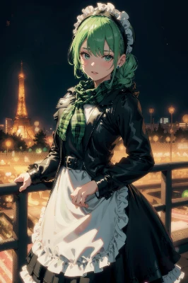 luster red latex outfit, 10 denier pantyhose, white hair, ponytail, blunt bangs, detail eyes, mauve eyes, watercolor painting, white maid headband, complex background, (Art nouveau):1.4, bust up,
