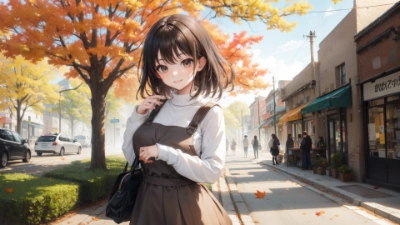 autumn cityscape,cowboy shot,((1girl)),solo,standing,looking at viewer,