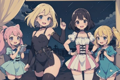 little girl, curvy, wide hips, flat chest, thighhighs,(masterpiece), absurdres, (best quality), best quality, 8k, beautiful art, ultra-detailed, illustration, ((kawaii)), cute, open mouth, messy hair, V-neck, (jumperdress), smile, walk in the park, hands behind head,,