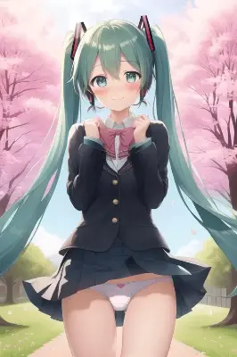 ((masterpiece)), ((best quality)), (ultra-detailed), ((kawaii)), cute, (lovely), illustration, cherry blossom tree, Hatsune Miku, Miku, gothic lolita costume, beautiful green hair, beautiful green eyes, ((beautiful eyes)), wearing underpants, ribon, flower bouquet, smile, ashamed, blush, wind effect