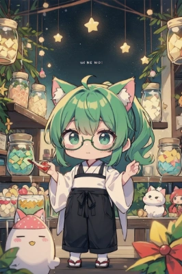 masterpiece,pinafore dress kimono tanuki-girl short-bob-brown-hair Thick eyebrows. high-fantasy-style cafe christmas-tree onigiri kawaii smile Break,calligraphy patterns, artistic lettering, beautiful scripts, penmanship, visual poetry, cultural expression, decorative writing,,,,