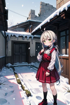 masterpiece, best quality, extremely detailed, anime, girl, skirt <lora:asb-CH1:0.7> <lora:hyperdetailer_v060:1> , pinafore dress, a pretty woman, longhair, ponytail, long sleeve, black hair, silver hair, blonde hair, red hair, yellow eyes, green eyes, purple eyes, older sister, ikemen, horror, colorful, ruins, snow,