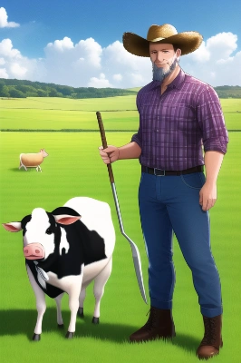 masterpiece, best quality, 1man solo,best quality, masterpiece,masterpiece back ground,highres, high quality,{{guy,man,male}},farmer,mature,Senior,50 years old,{{overall}},flannel shirt,plaid,boots,thin hair,beard, holding pitchfork,straw hat,(cowboy shot:1.3),Front facing, farm,grass,cow,pig, chicken,heaven,blue sky,