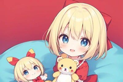 masterpiece, best quality, extremely detailed, anime, girl, skirt,(magical girl:1.4),smile,outdoors,hair bow,red bow,blue eyes,blond hair,short hair,,