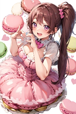 girl, cute, smile, open mouth, hands up, fun, (brown hair, long hair:1.2), side ponytail,