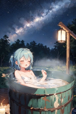 (cute illustration:1.2), snow, ice, mountains, starry sky, (aurora:1.2), vapor, cold,