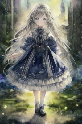 masterpiece, best quality, extremely detailed, anime, magical girl, looking up the stars, midnight, sadness, ruins, frills , watercolor, colorful, fantasy, , <lora:flat2:-1> <lora:saturation:-0.6> ,