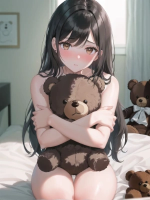 A woman is sleeping while( holding a stuffed animal:1.2).
