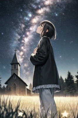 masterpiece, best quality, extremely detailed, anime, church sister, solo, bobcat, black hair, looking up the milky way, starry sky, standing, side view, far view, church ,night, grass field, praying, nostalgic, sadness, darkness ,<lora:saturation:-0.35> <lora:make25d_type3_v100:1> ,,,