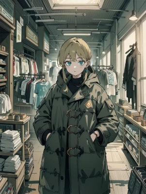 (village, houses, public buildings, village green,:1.2) (coffee shop,:0.8), (down coat, down jacket:1.2)