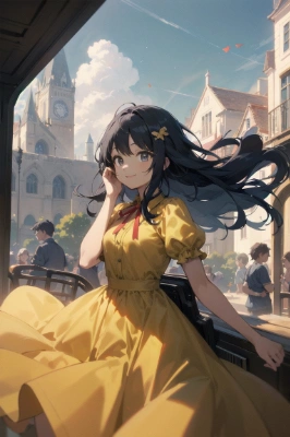 masterpiece, best quality, extremely detailed, anime, a girl, upper body, princess, young lady, beautiful girl, beautiful, victorious, tomboy, smile, happy, be impressed, Latin, Spanish, dark eyes, dark skin, black hair, long hair, floating hair, putting red hair ribbon on her hair, medieval, completely yellow dress, yellow classic princess dress, long skirt, running carriage, luxury carriage, leaning out the carriage window, wind is blowing, right hand on own face, blue sky, colonial townscape, tropical country, Age of Discovery,middle age,fantasy,